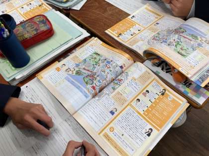 写真は社会の授業。自分がコンビニエンスストアの経営者になったとしたら…一人で考えた後、班で意見を交流し考えを深めました。