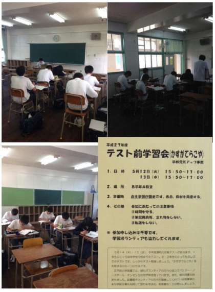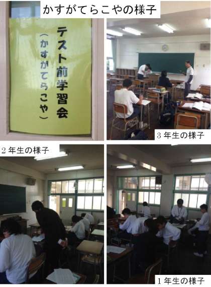 明日からの中間テストを控え、放課後は元気アップ事業のひとつであるテスト前学習会「かすがてらこや」はじめ、自主的にクラブ活動で学習会を行うなど、試験モードに入っています。