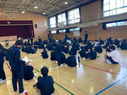 出発式。学年代表生徒の挨拶に続き、班ごとに忘れ物がないか確認中。