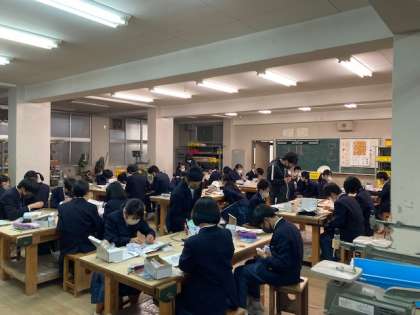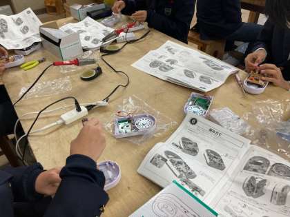 2年技術科の授業ではラジオを制作中。手回しで充電できる便利なものです。