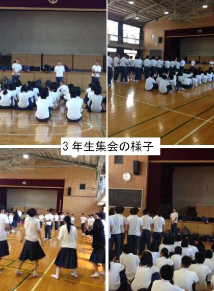 3年生は明日から九州方面に修学旅行に出かけます。体育館で各先生から最後の諸注意があり、そのあと生徒企画の集会が行われました。