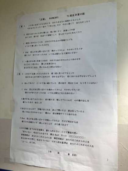 75期生卒業の歌「RADWIMPS」の「正解」が掲示されていました。