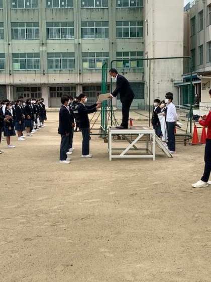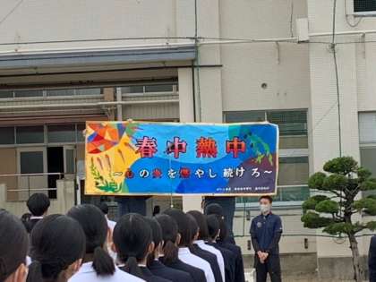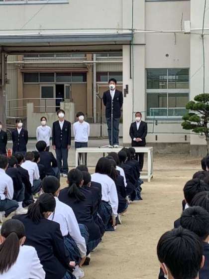 今週の全校集会では陸上部の表彰、美術部が制作した横断幕のお披露目がありました。全校集会のあと、「いじめについて考える日」ということで校長先生の講話と、生徒会から「NO!いじめ みんなでつくろう安全で楽しい学校」というスローガンの発表がありました。