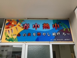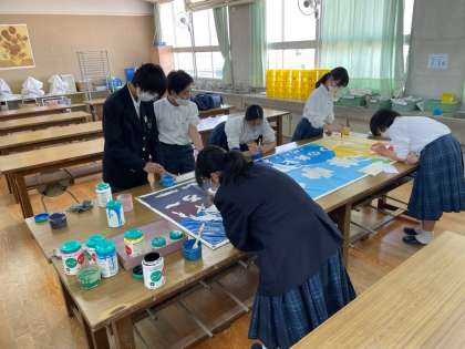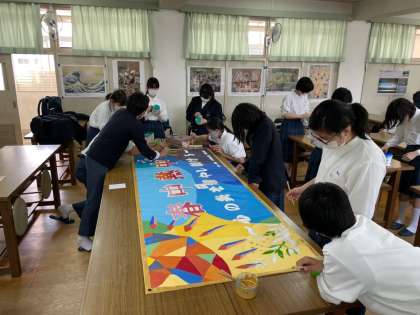 先日発表されたスローガンの横断幕の作成の様子です。鮮やかで綺麗な横断幕に仕上げてくれました。体育館前の校舎入り口に飾ってあります。美術部の皆さん、ありがとうございました。