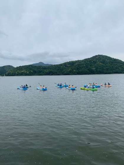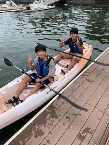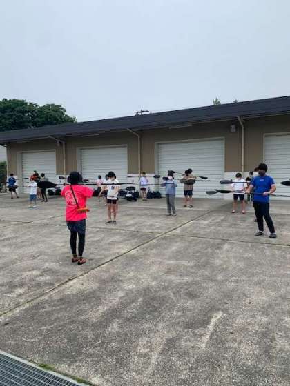 陸地でパドルの練習をして、2人組になってカヤックに乗ります!いざ久々湖へ!