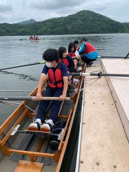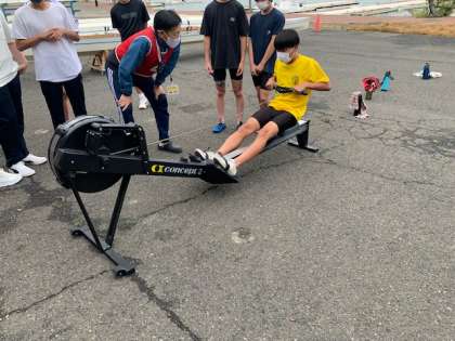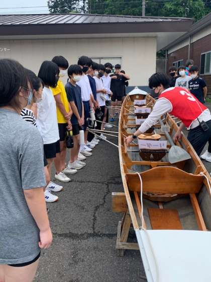 オールを漕ぐ練習をしています。コツを掴むのが難しいみたいですが、5人の息が合わさるとスピードが出ておもしろそうです。