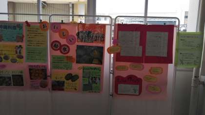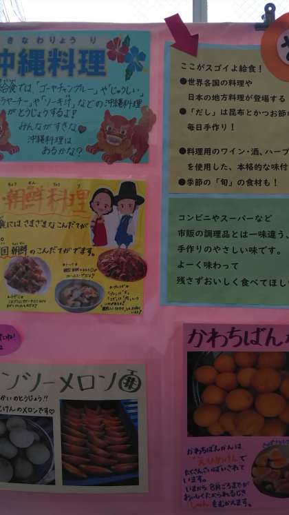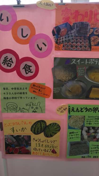 食育月間の取り組みとして給食を取り上げた掲示物が本館2階の廊下に張り出しています。給食を作っていただいている小学校の栄養教諭とのコラボの作品です。食は体の基礎になるものです。この機会に食に関わることを学んで欲しいと思います。