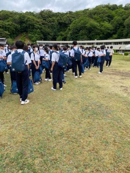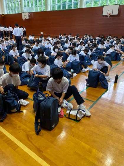 京都府青少年海洋センターマリーンピアに到着しました。天候の関係で浜辺ではなく体育館で昼食を取ります。昼食終了後、入所式を行います。