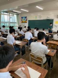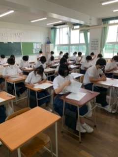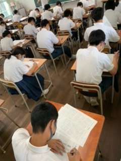 今日は3年生の初めての実力テストです。朝から緊張した雰囲気で、教科書や資料集、参考書で確認をしていました。全力で頑張ってください!