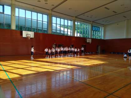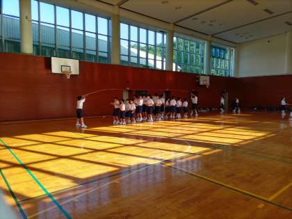 お昼ごはんの後、「大縄大会に向けての練習」「アスレチック・砂浜アート」「カッター活動」を交代で取り組みました。