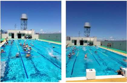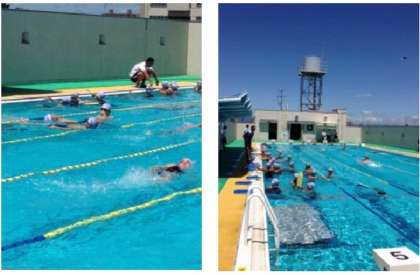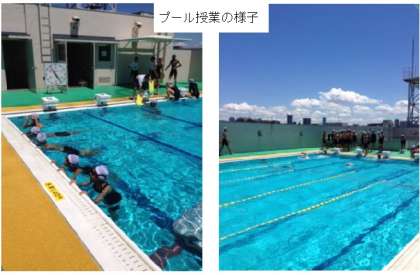 澄み切った青空の下、本館屋上にあるプールで体育授業が行われています。今日のプールは気持ちいいでしょうね。
