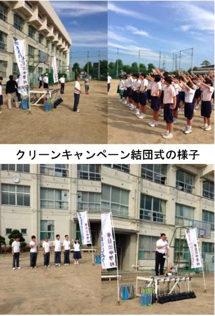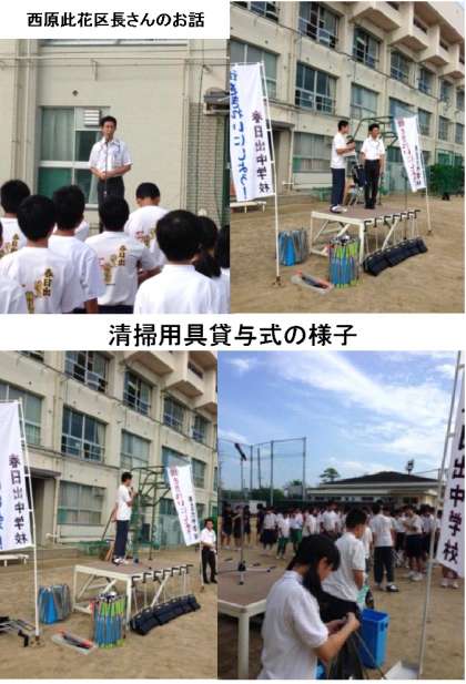午前8時に中学校で結団式を行い、西原区長さんから金バサミ等清掃用具の貸与式がありました。参加生徒は生徒会はじめ陸上部・ソフトテニス部・バレー部・バドミントン部・サッカー部・美術部の有志の生徒たちです。