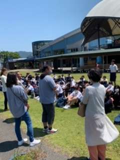 全員が揃ったので退散式をしています。春日出中学校の生徒は礼儀が正しくて元気だと、お褒めの言葉をいただきました。これからも色んな縁を大切にして、この経験を生かせるといいですね。