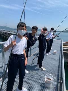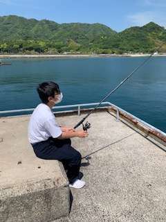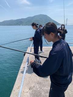 魚釣り体験です。さびき釣りという方法で釣りを楽しんでいます。釣りの経験者も多く、工夫しながら狙っています。