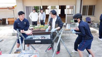 イノシシ丸焼き体験です。イノシシの肉の塊を焼いています。焼いたお肉はサンドイッチにしておいしくいただきました!