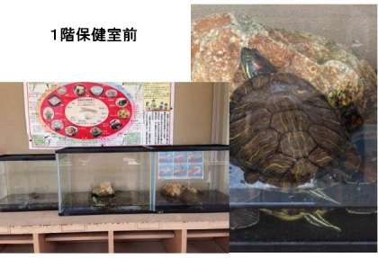 本館1階の保健室の前に3つの水槽があるのを知っていますか?その中には1匹ずつカメが入っています。いつからあるのか?どうしたのか?詳しい事は解りませんが、数年前に運動場の端で発見されたみたいです。