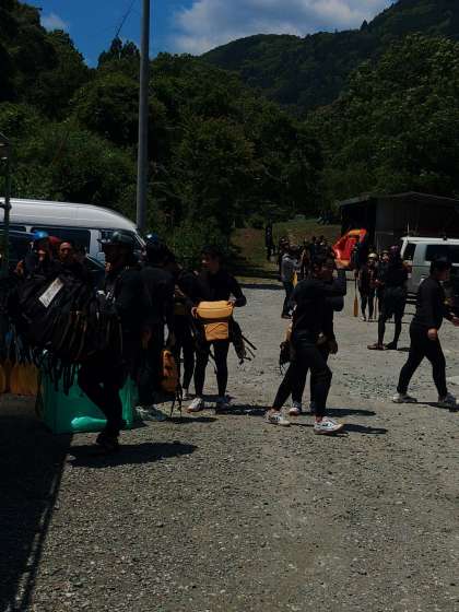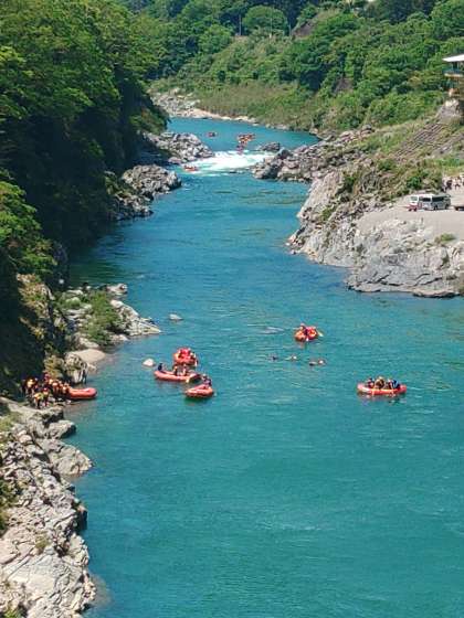 ラフティングを終えて次の中野うどん学校に出発しました。ラフティングは大いに楽しんで、最後は岸まで泳いでいます。