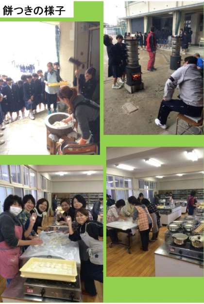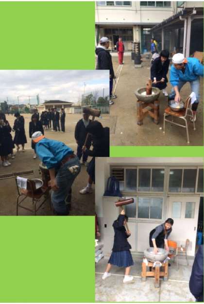 休み時間には、生徒も餅つきの手伝いをしてくれています。全生徒分の餅を丸めるため、餅をつく方も、丸める方も大変です。