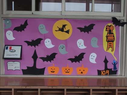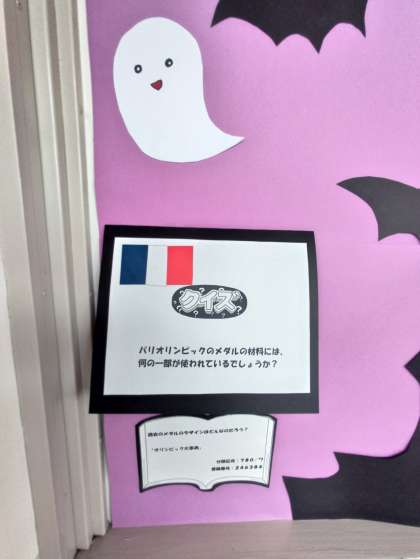 図書室入口付近に掲示板があります。季節ごとに学校司書の平野さんがデコレーションしてくださってます。また、図書に関心を持ってもらうために時事のクイズなどが載っており工夫していただいています。図書室までは遠いですが一度、見てください。