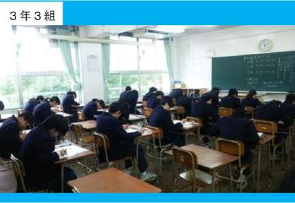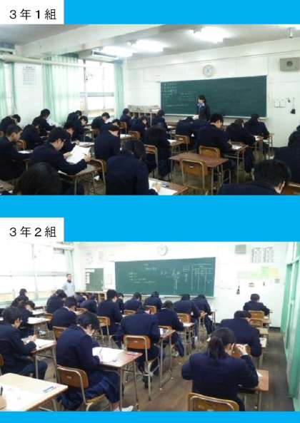 3年生は、中学校最後の実力テストを受けています。今日は「英語」、「国語」、「社会」の3教科で、残り2教科「数学」、「理科」は明日の土曜授業で実施します。