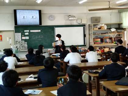1年生の美術の授業では、「手ざわりこだわりブックカバー」の制作が進められていて、この日は、それぞれの完成品を発表する授業が行われました。