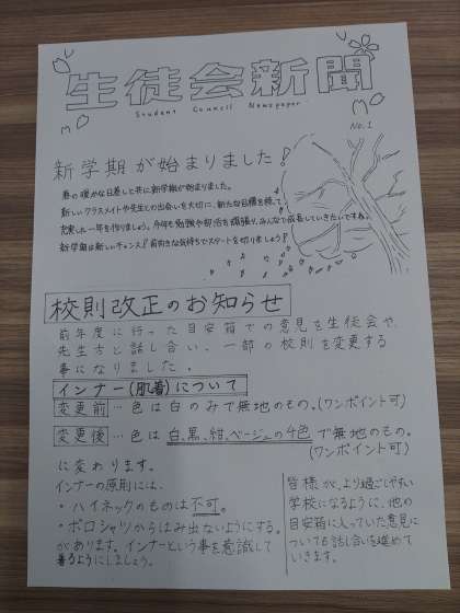 月曜日は全校集会が2週に1回あります。今朝は校長先生から今週末にある万博の話でダーウィンの進化論と関連したものでした。生徒会からは、校則改正のお知らせがあり、目安箱からの意見が現実化しています。自分たちで見直し、作っていくためには全校生徒の協力が必要です。