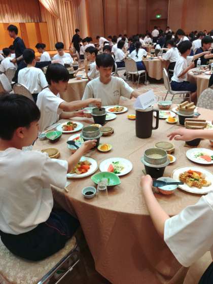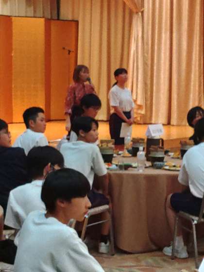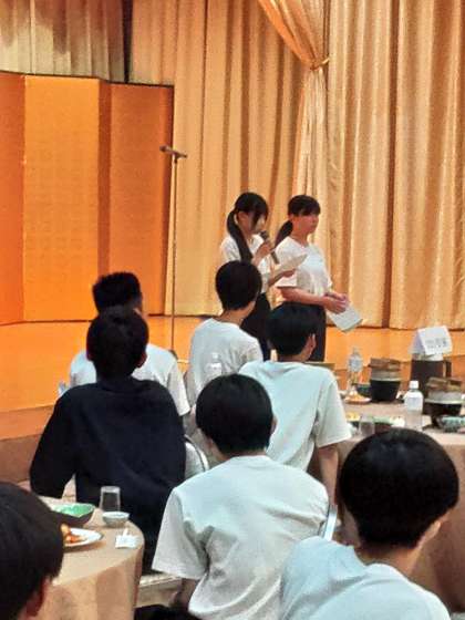 夕食の時間になりました。入館式を行い、宿舎の方にご挨拶をいただきました。みんな、美味しくいただきましょう。