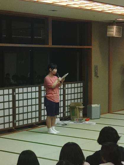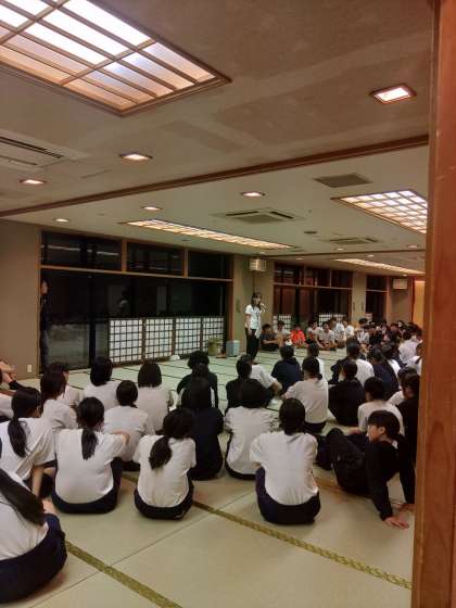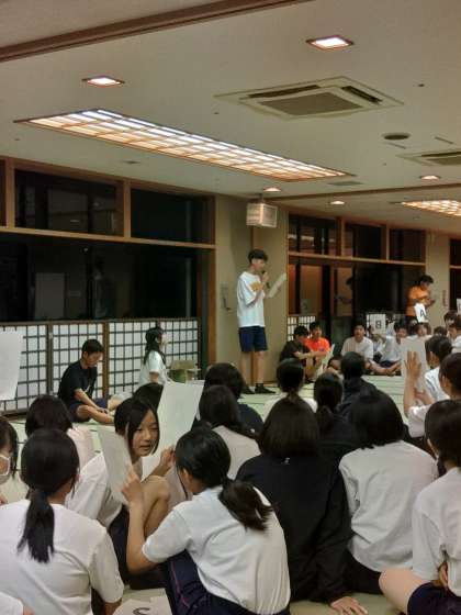 夜レクの様子です。修学旅行実行委員のクイズ大会も終わり、夜レクも終わりです。最後の指示があり、就寝準備にかかります。本日のHPの掲載は終わらせていただきます。ありがとうございました。