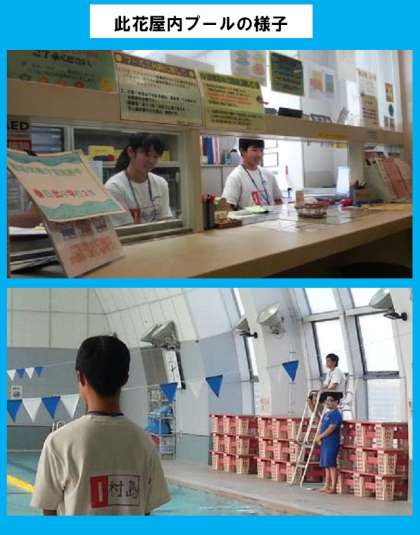 受付・プール監視・トレーニングジムの3ヶ所に分かれて体験しています!