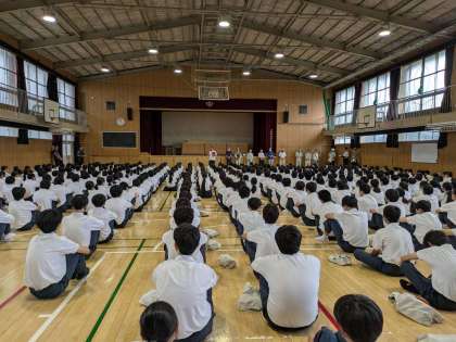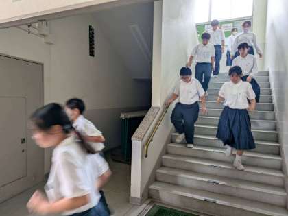 中間テスト1日目ですが放課後の時間を使って避難訓練を行いました。今回は地震を想定したものでした。揺れが収まるまでは机の下で待ちます。揺れがおさまったら安全を確認の上、「おはしもて」の要領で雨が降っていたので体育館へ集合しました。体育館では校長先生の話と此花消防署の永田消防司令様からお話をいただきました。