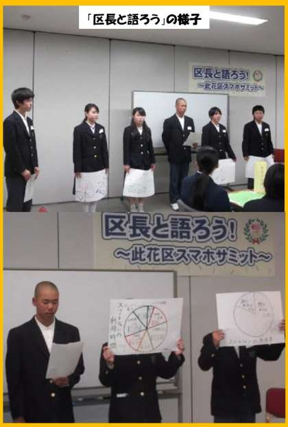 西原区長より、「中学生自身がスマホの正しい使い方を啓発するため、此花区生徒会としてのスローガンを考えよう」と提案がありました。