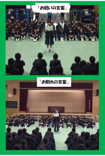 次に「お祝いの言葉」を2年生徒会執行委員の山田さん、「お別れの言葉」を3年生徒会執行委員の嘉津君が述べました(写真:中)。