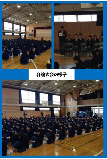 さて、今日は土曜授業を行っています。1,2時間目は通常授業を行い、3時間目に体育館で弁論大会を行いました。