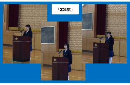 2年生発表者は、前田 美空さん(2−1)「やりきる」、山下 華歩さん(2−2)「もう二度と」、鈴木 千晶さん(2−2)「命について」。