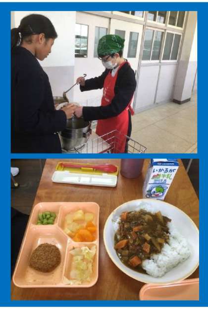 メニューは、「カツカレーライス(一口カツ)」・「枝豆」・「キャベツのピクルス」・「フルーツミックス」・「米飯」・「牛乳」です。