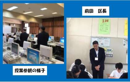 区役所から、前田区長さん、池田副区長さん等5人が来られ、1時間でありましたが校内を見学されました。パソコン教室から始まり普通教室、図書室、体育館、グランド、最後はなかよし学級もご覧なられました。各教室で、生徒たちの勉強している様子に感心しておられました。