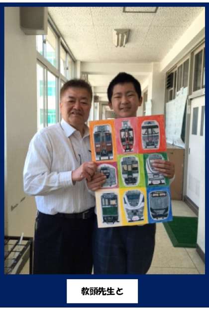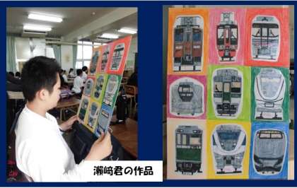 タイトルは『電車のモザイクアート』です。せざき くんは電車が大好きで、100枚以上描いています。