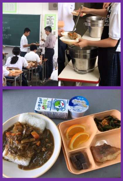 本日の給食のメニューは、「カレー丼」・「赤魚の塩焼き」・「小松菜とにんじんのおひたし」・「こんにゃくの煮もの」・「オレンジ」・「ヨーグルト」・「米飯」・「牛乳」でした。