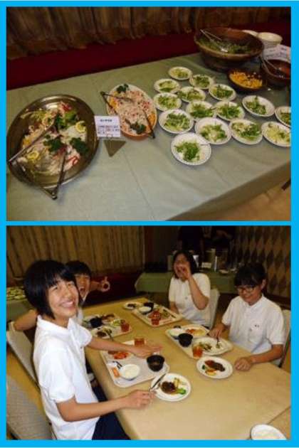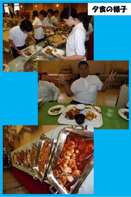昨夜の夕食(バイキング)の様子です。1人1皿ですが、焼きたてのステーキがあったり、デザートがあったりしました。