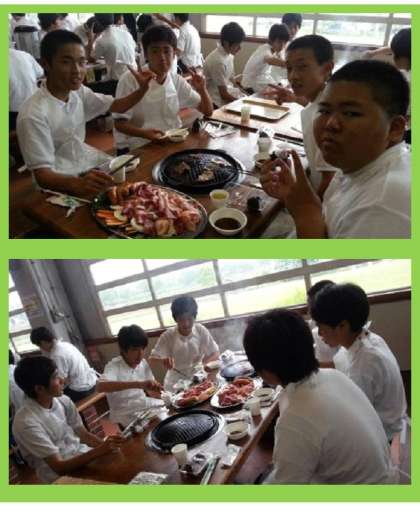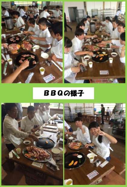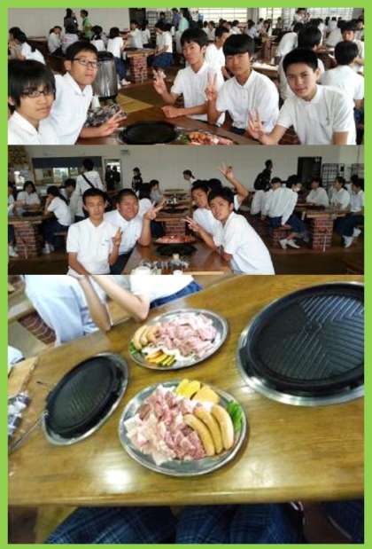 修学旅行最後の食事はバーベキューです。談笑しながら食べていました。