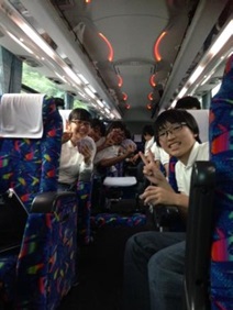 スヤスヤ寝ている生徒もいれば、カードゲームを楽しむ生徒も。少し遅れていますが、6時現在、宇治市を通過。安全運転で、もうすぐ帰ります!