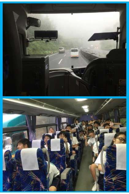 さきほど、奈良に入りました。すごい霧ですが、みんなは、元気いっぱいです。(2年2組車内)