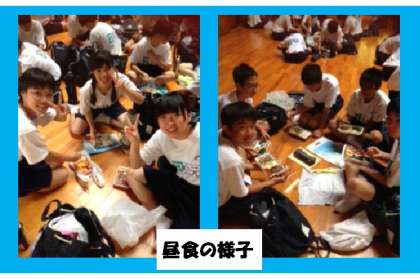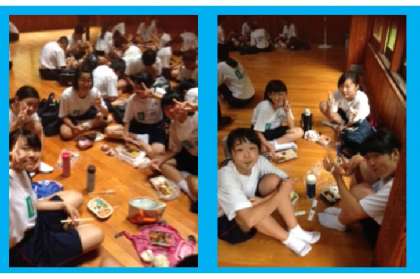 昼からの活動に備えて体育館で先にお昼ごはんです。