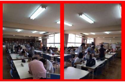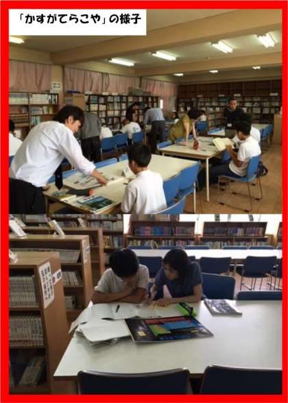 図書室で自学自主学習会「かすがてらこや」が7月21日(木)から、午後2時より行われています。本日生徒の参加者は10人で、学習ボランティアの指導員さんが8人。ほぼ、マンツーマン状態で行われています。