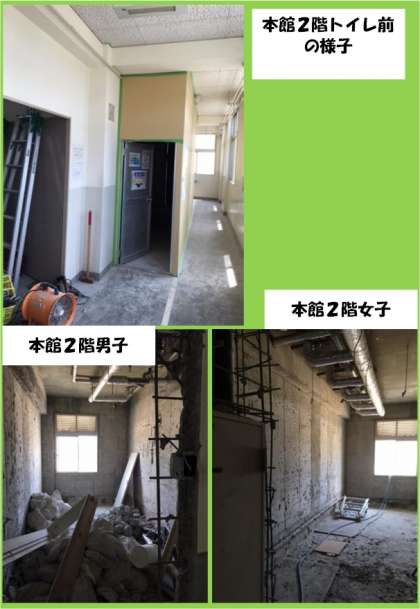 本館1階から3階までの男女トイレの改修工事が夏休みに入ってから行われています。今日現在の様子は室内の全ての物を撤去しています。完成は11月です。不便をかけていますが、もうしばらく辛抱してください。出来上がりを楽しみにしといてください。