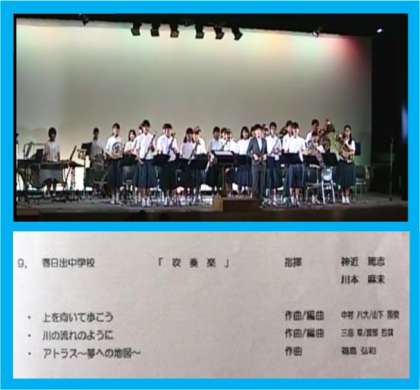 発表した曲は、坂本九の名曲である「上を向いて歩こう」、井上陽水の「少年時代」、そしてコンクールで演奏し、優秀賞を受賞した「アトラス〜夢への地図〜」の以上3曲を演奏しました。(顧問:川本、神近、奥田)