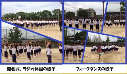 続いて開会式、ラジオ体操。先生方のアドバイスのもと、前回よりしっかりできました。閉会式前のフォークダンス。そして閉会式の形になりました。(担当:1年生)