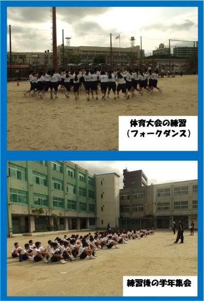 9月23日(金)、20日(火)の臨時休業でなくなった授業を補てんするために、4時間目に月曜日の2時間目の授業が入り、5・6時間目に体育大会の全体練習が行われました。昼食後の全体練習は先週に続き2回目だったので、スムーズに行動することができました。前回に注意されたこと(1.行進のリズムの取り方・手の振り方、2.無駄な私語、3.1つ1つの行動を素早くすること)を意識して練習に臨みました。行進のレベルは学年練習で何度も行ったので、最初とは比べものにならないぐらい上手くなりました。しかし、応援席や招集場所での私語がなくなりません。「自分ぐらいは・・・。隣の人と少ししゃべるぐらいは…。」という自分勝手な行動が団体行動では、みんなの頑張りを台無しにしてしまいます。見る人を感動させる行動ができるようになりましょう。最高の体育大会を目指して頑張りましょう!!(担当:若月)