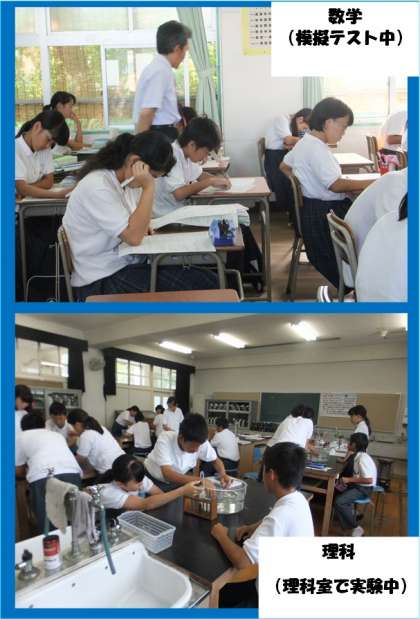 10月7日(金)、2学期がスタートしてから、体育大会に向けてどのクラスでも欠席者が減っていき、良い雰囲気で頑張れていましたが、体育大会後から、風邪(発熱・頭痛・腹痛など)による欠席者が増え始めています。心配なのは、2〜3日以上長引く場合もです。中間テスト直前になり、一生懸命にテスト勉強をしている人もいると思いますが、体調管理には十分に気をつけてください。1〜4時間目まで45分授業で、昼食後すぐに清掃を行い、終礼をした後、トイレ休憩を入れてから5時間目(50分間)の授業、5時間目が終わるとすぐに下校しました。(校内研究授業のため)部活動がある人は、16時15分に再登校しました。どの授業でもテスト前ということもあって、実力確認のテストが行われていました。結果を見て危機感を持った人は、土・日・月の3日間の時間を有効につかって勉強しましょう!!(担当:若月)