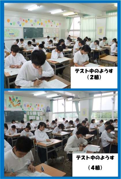 10月13日(木)、中間テスト2日目でした。1時間目;社会、2時間目;数学、3時間目;英語でした。今週に入ってから急激に気温が低くなっている影響もあって、頑張って登校してみたものの、途中でしんどくなる人や欠席する人もいました。3教科のテストがあったことと、どのテストも1学期に比べて内容が難しくなっているので、テストとテストの間の休憩時間の友だちどうしの会話を聞いていると、「ほんまに難しかった〜やばいかも…。」と言っている人が多くいました。(友だちの前で謙遜しているだけで、実は自信を持っているはずと信じています。)テストが終わると、「終わった〜」と嬉しそうな声が廊下中に響き渡っていました。いつもより丁寧に掃除をして、終礼をして下校しました。午後からは、部活動で頑張っている人の元気な声が聞こえてきました。さあ、中間テストが終わったら、次は文化祭ですよ。(担当:若月)